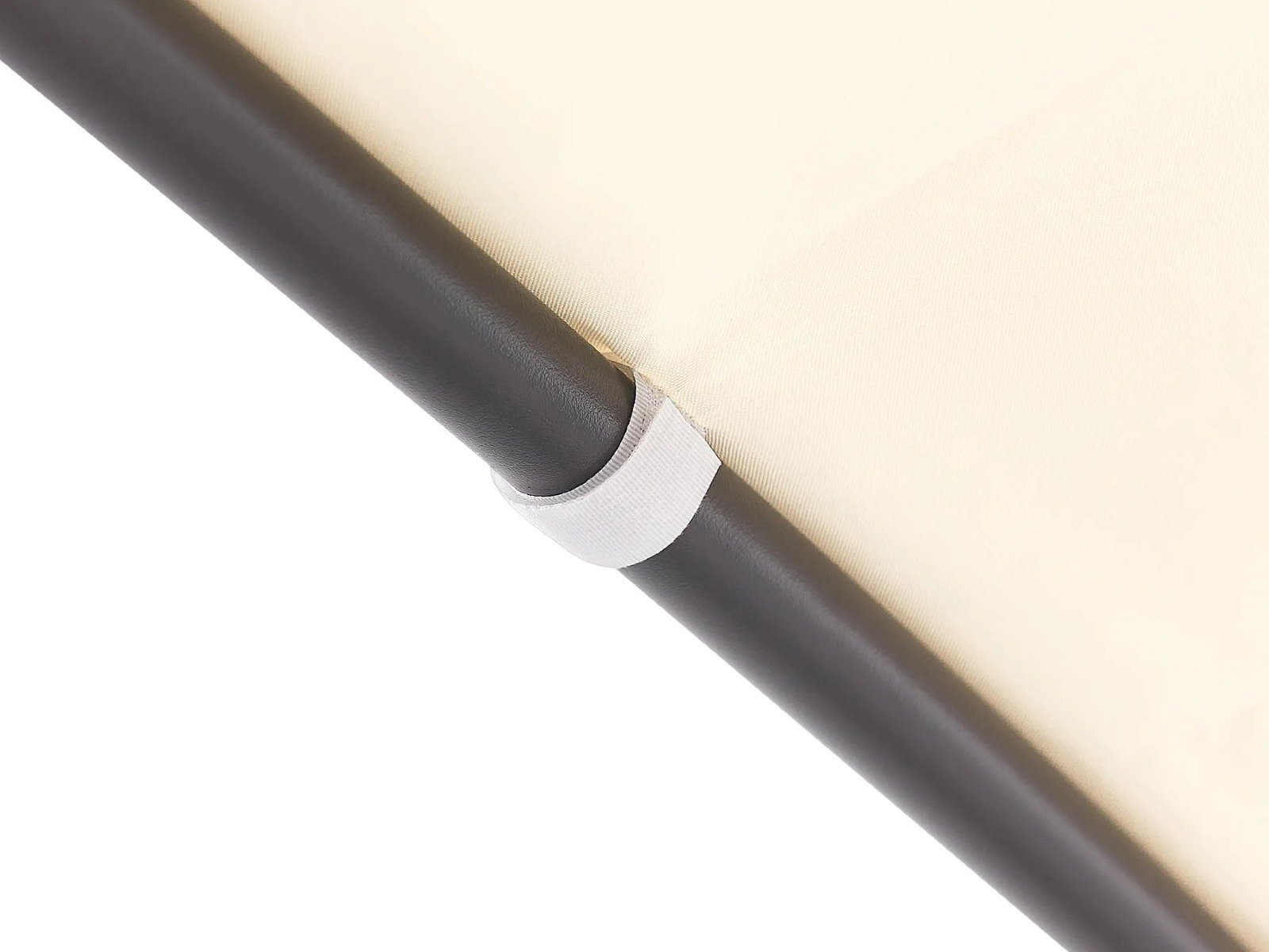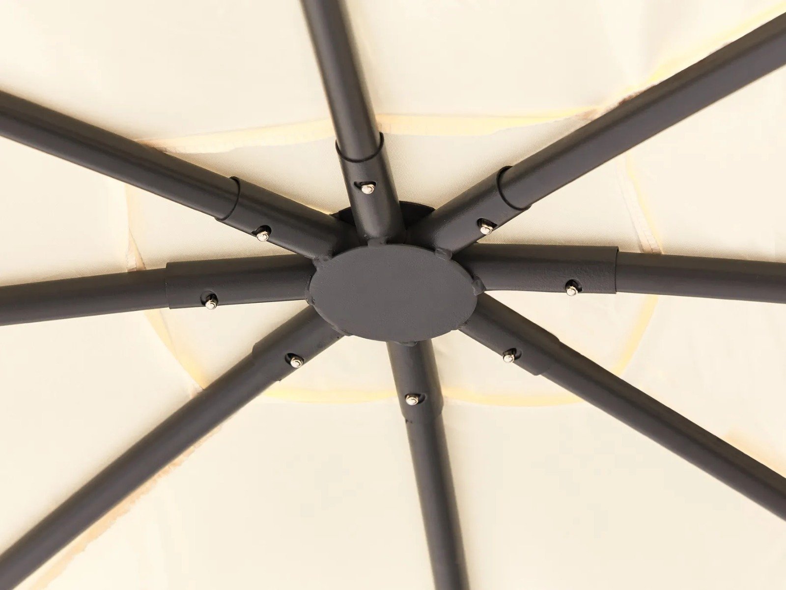 Robusta estructura de acero con recubrimiento en polvo en color negro, combinada con un toldo beige versátil. Ofrece una excepcional protección UV UPF 50+ (filtra el 98% de la radiación UV). Se instala fácilmente con estacas, sin necesidad de cimientos.