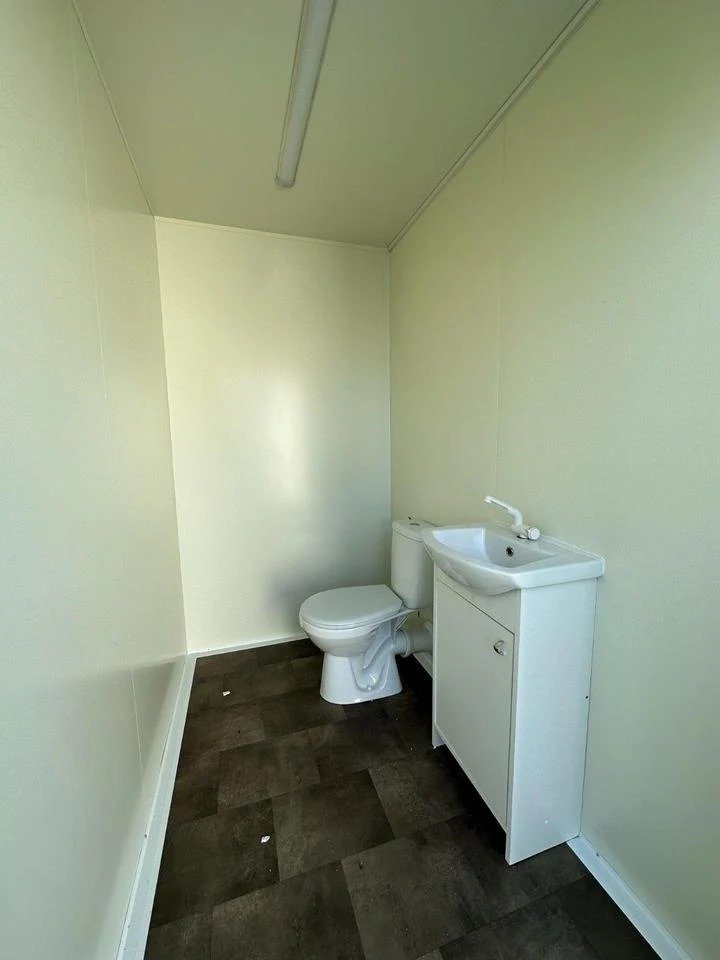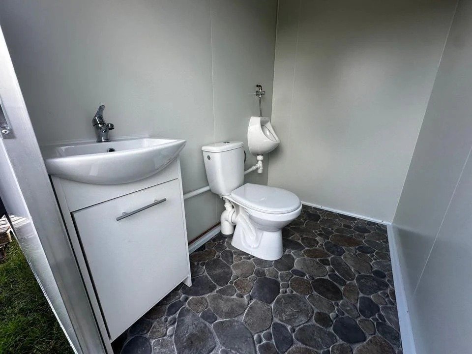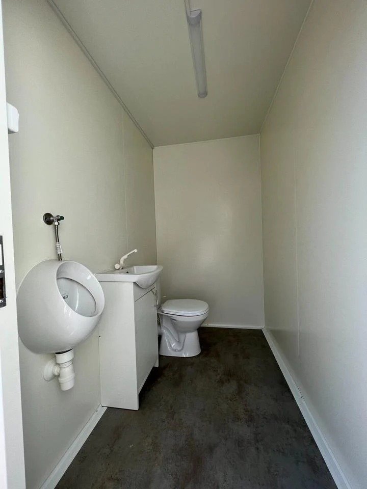 El remolque está dividido en dos compartimentos, para hombres y mujeres. El área de hombres incluye un inodoro, un urinario y un lavabo con mueble, mientras que el de mujeres dispone de un inodoro y un lavabo. La estructura, fabricada con paneles sándwich de 40 mm de espuma, garantiza un excelente aislamiento. Además, cuenta con una instalación eléctrica completa y un convertidor de voltaje para un funcionamiento autónomo.